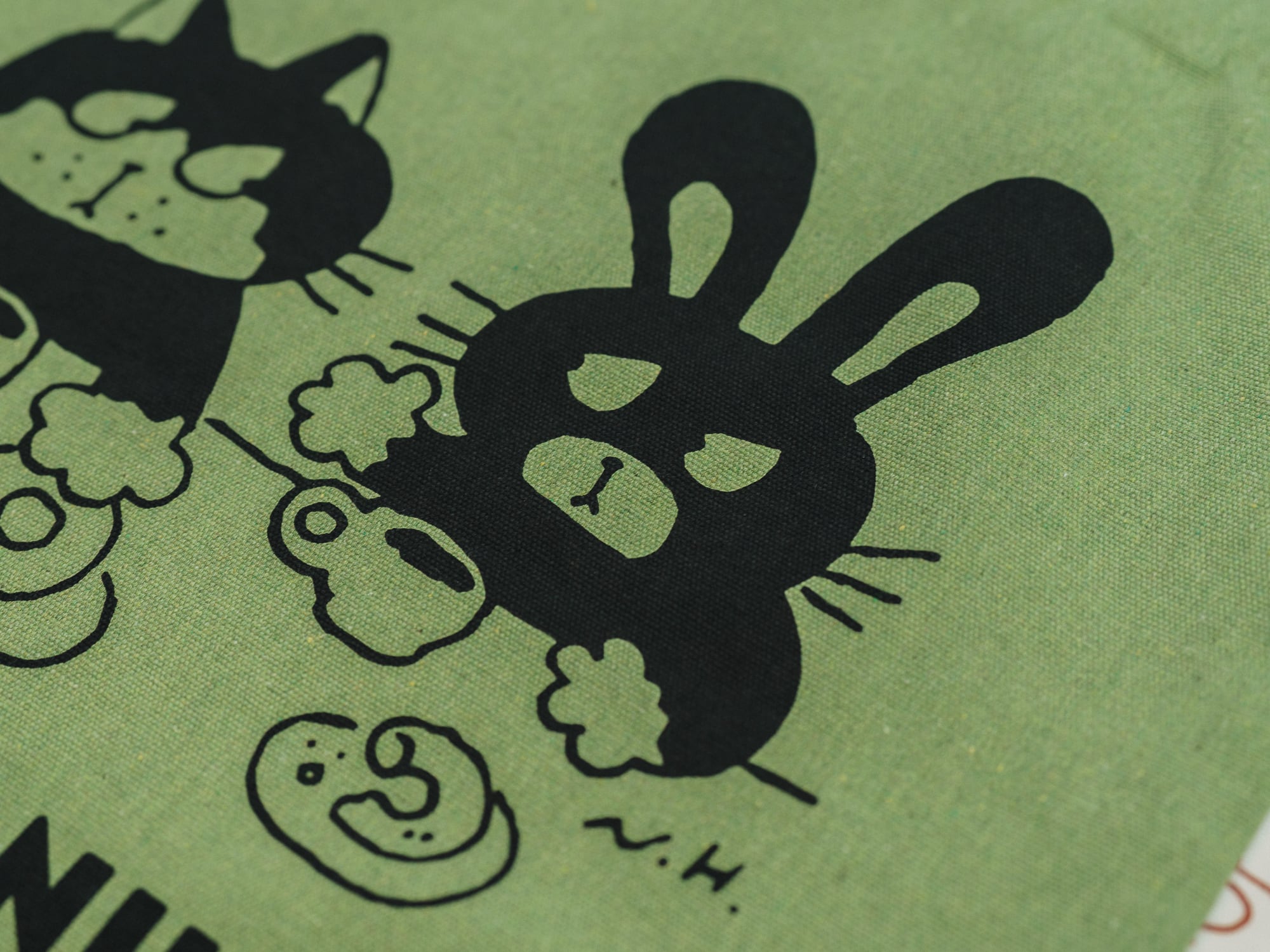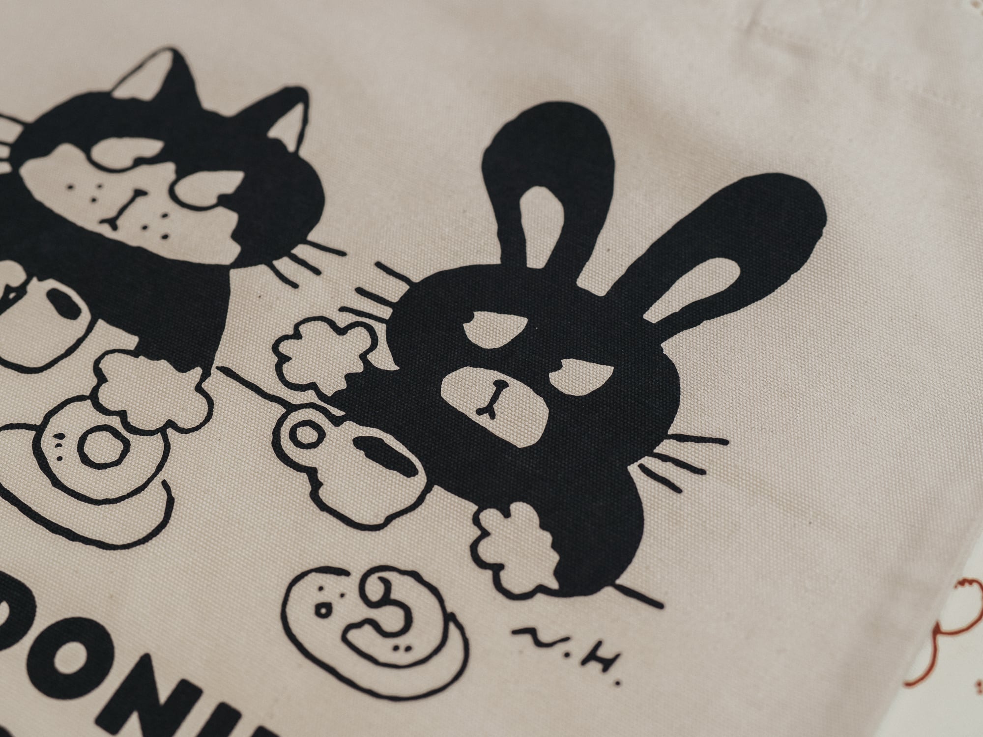 仲良くコーヒーブレイクをする少し目付きの悪いネコとウサギの肩掛けトートバッグ。