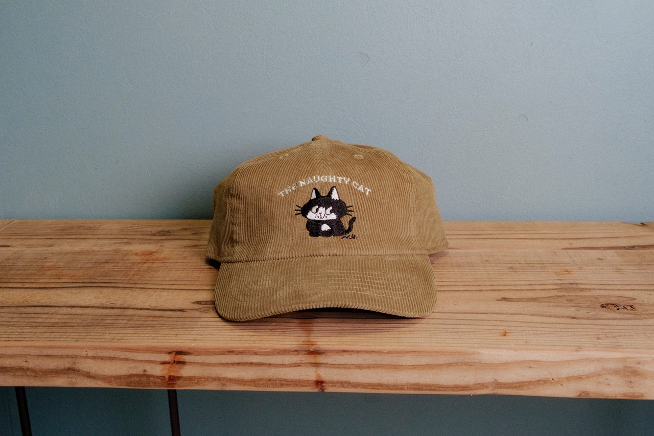少し目付きの悪いネコの刺繍が入ったキャップ。